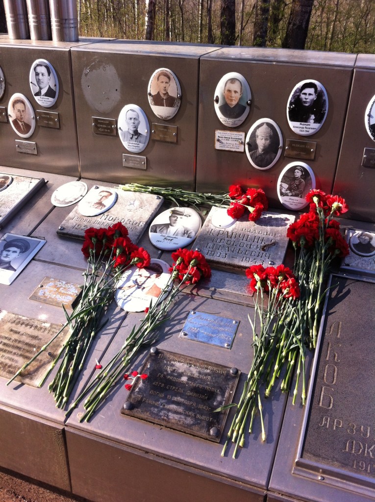 After the Wehrmacht’s retreat from northwest Russia and the final Soviet victory in Berlin, the reconstruction process began in Leningrad and the surrounding Oblast region. The exact number of Soviet soldiers who died at the Leningrad front is unclear, but it has been confirmed to be over 1 million.[iv] The majority of the soldiers were buried in mass graves, either where they fell or close to the battlefields. ,The corpses were buried right on the battlefields of Sinyavinsky Heights, in mass graves. Until the late 1970s, the Heights remained a battlefield, with bullets and gas masks scattered around. The Oblast government then decided to remodel the battlefield into a memorial complex to mark the 40th anniversary of the Soviet victory.[v] The original plan was to turn the Sinyavinsky fields into a memorial park, including an open-air museum. The exhibition was intended to show the daily front life of the soldiers: the foxholes, shelters, outposts and weapons, such as tanks and rockets launchers. The open-air museum was never realized due a lack of funding, but the Sinyavinsky Heights were transformed into a memorial complex for “the defenders of the Motherland”. In this memorial complex, the visitor walks towards the main memorial via an Alley of the Heroes of the Soviet Union, a path with monuments and grave stones donated to heroes and veterans. In front of a mass grave stands a red granite obelisk with a Red Army star, marking the center of the complex. The obelisk holds the inscription “The fallen of the Soviet War, who fell in the Battle of Leningrad, on the Sinyavinsky Heights 1941-1944”. Two plaques are installed on the same obelisk, to remember two Heroes of the Soviet Union, Vladimir I. Ermak (1924-1943) and Stulan B. Baimagambetov (1920-1943), who are both buried in a mass grave within the complex. The remodeling of the Sinyavinsky Heights cost 2 million Russian rubles and was opened in 1985, for the 40th anniversary of the end of the Great Patriotic War .[vi]